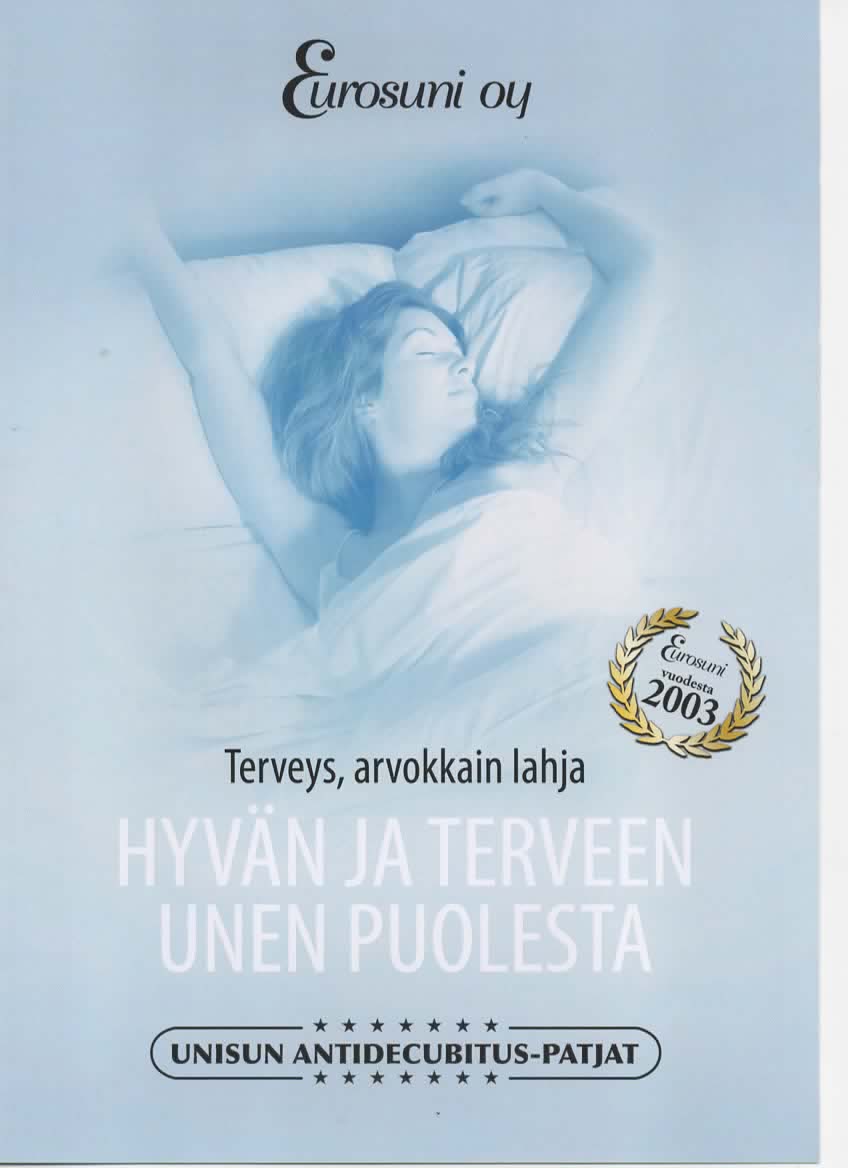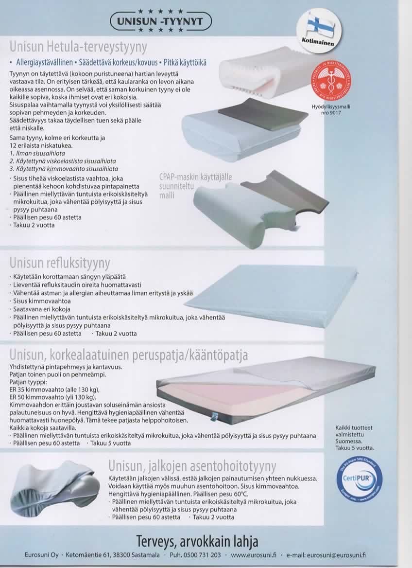 Eurosuni Oy on suomalainen terveysalan perheyritys, joka on toiminut vuodesta 2003 alkaen. Yrityksen toiminta-ajatuksena on edistää ja ylläpitää ihmisten terveyttä ja hyvinvointia. Yritys valmistaa ja markkinoi laadukkaita terveyspatjoja ja terveystyynyjä sekä asennon tukemiseen liittyviä pehmusteita.